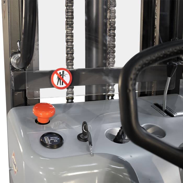 No painel reúnem-se diversas funções: Interruptor com chave e botão de emergência garantem que o equipamento possa ser desligado com segurança mesmo em uma eventual emergência. Alavanca de comando dos garfos que permite controlar a velocidade de descida dos mesmos para manuseio de cargas frágeis. O indicador de carga da bateria de fácil leitura.